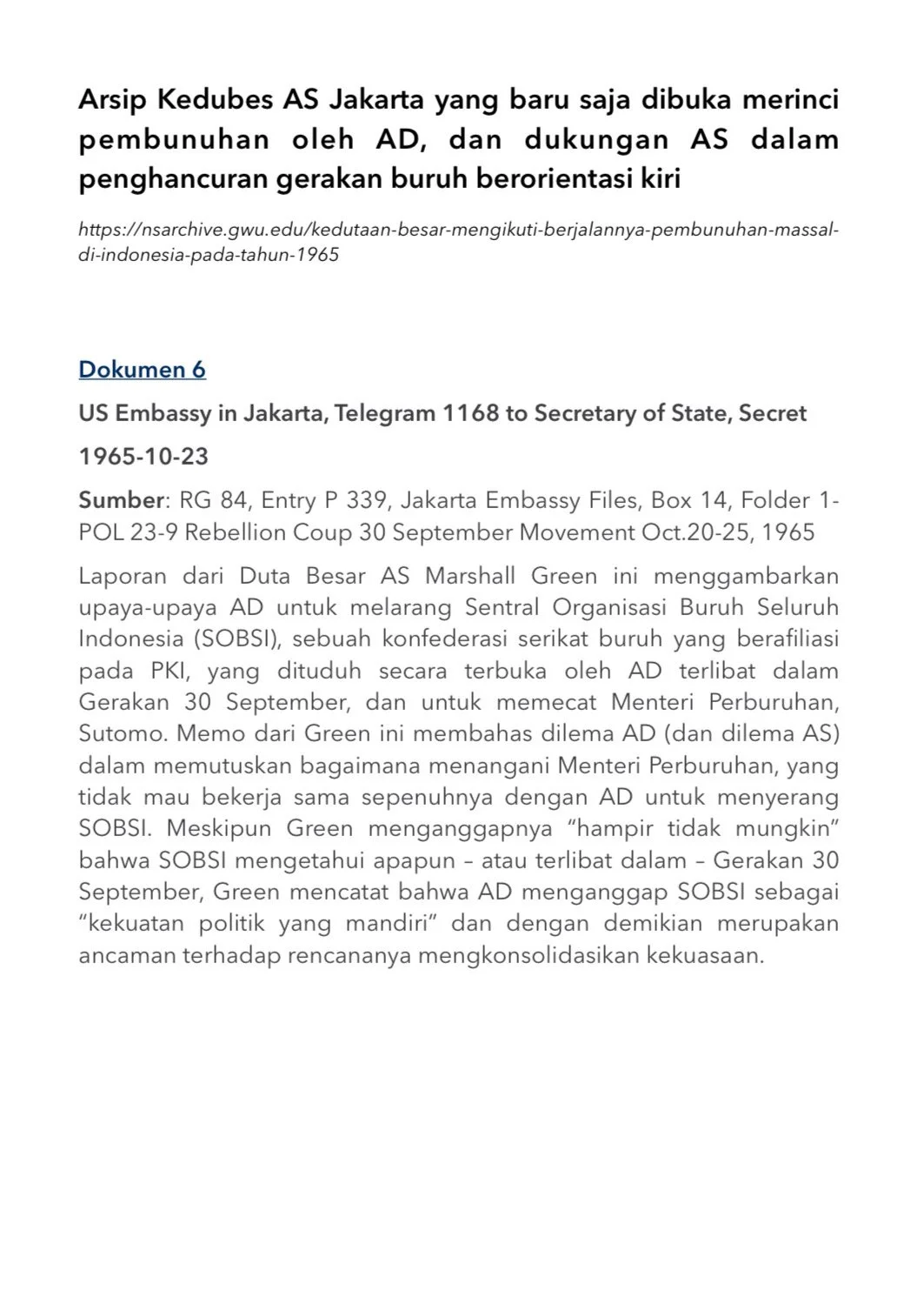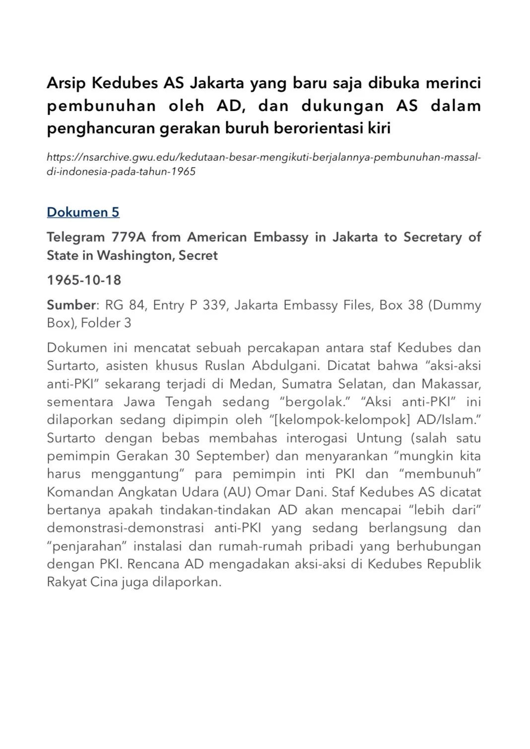 DOKUMEN 7 - 39, ARSIP KEDUBES AS JAKARTA YANG BARU DIBUKA MERINCI PEMBUNUHAN OLEH AD DAN DUKUNGAN AS DALAM PENGHANCURAN GERAKAN BURUH BERORIENTASI KIRI